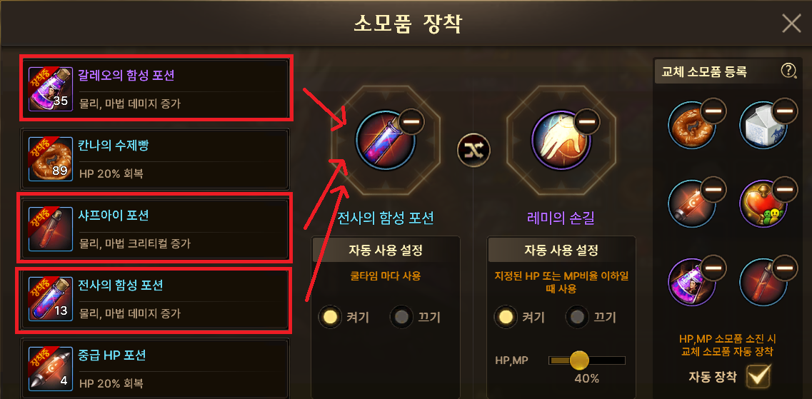 레미의 손길 / 칸나의 수제빵 / 하급or중급or상급 HP 포션