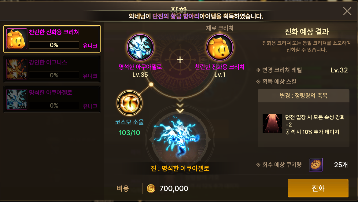 5월 19일 패치 후 찬란한 진화용 크리쳐가 지급되었습니다.