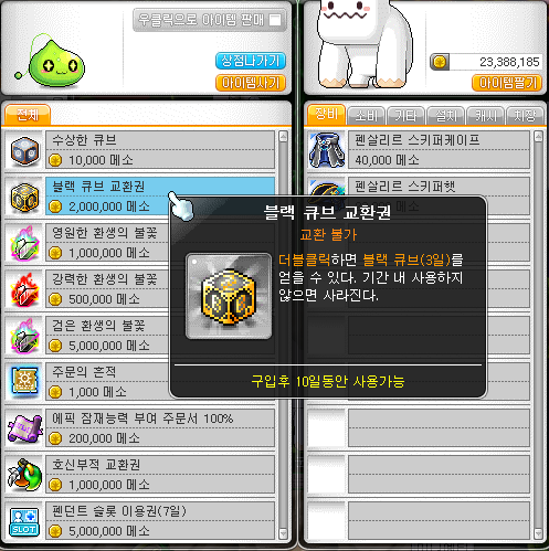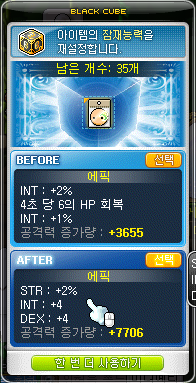 2) 소비창의 블랙큐브 교환권 사용 후 장비에 블랙큐브 사용