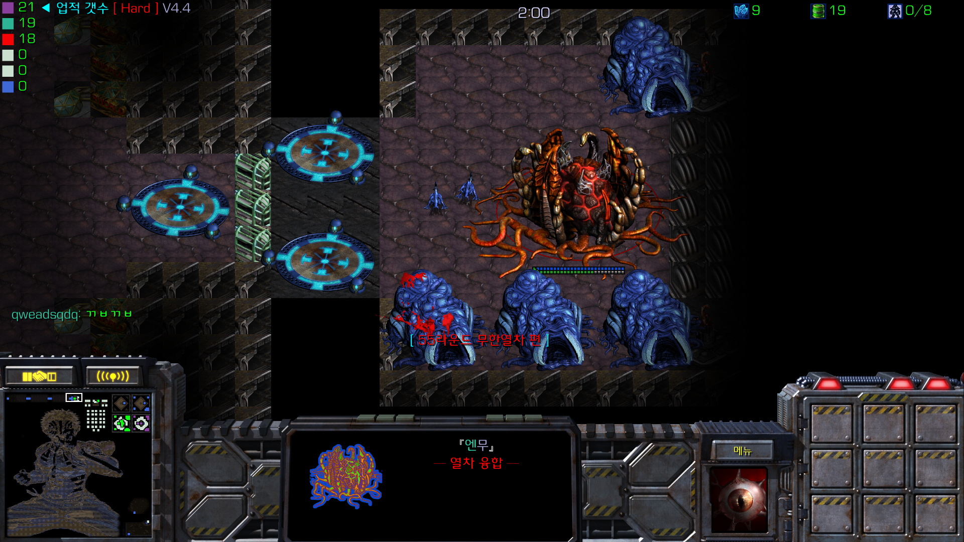 지금까지 확인된 엔무의 스킬은 엔무 건물 기준으로 위 아래로 울트라리스크 캐빈(울트라리스크 건물)이 각 3개씩 총 6개가 생기며 이 상태에서는 엔무 건물은 무적이 됩니다. 모든 사람이 일점사로 하나 씩 깨주면 됩니다. 울트라리스크 캐빈 6개를 깨준 다음에는 엔무 건물을 공격하여 깨주면 됩니다.