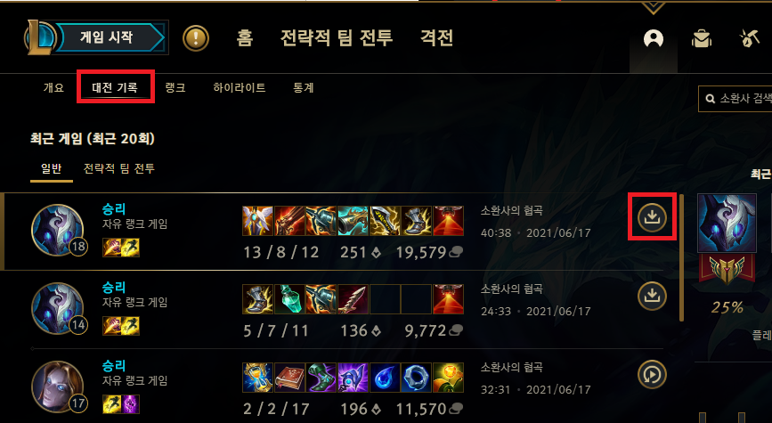 내정보 -> 대전 기록에 들어가셔서 원하는 경기의 리플레이를 다운로드 해줍니다.