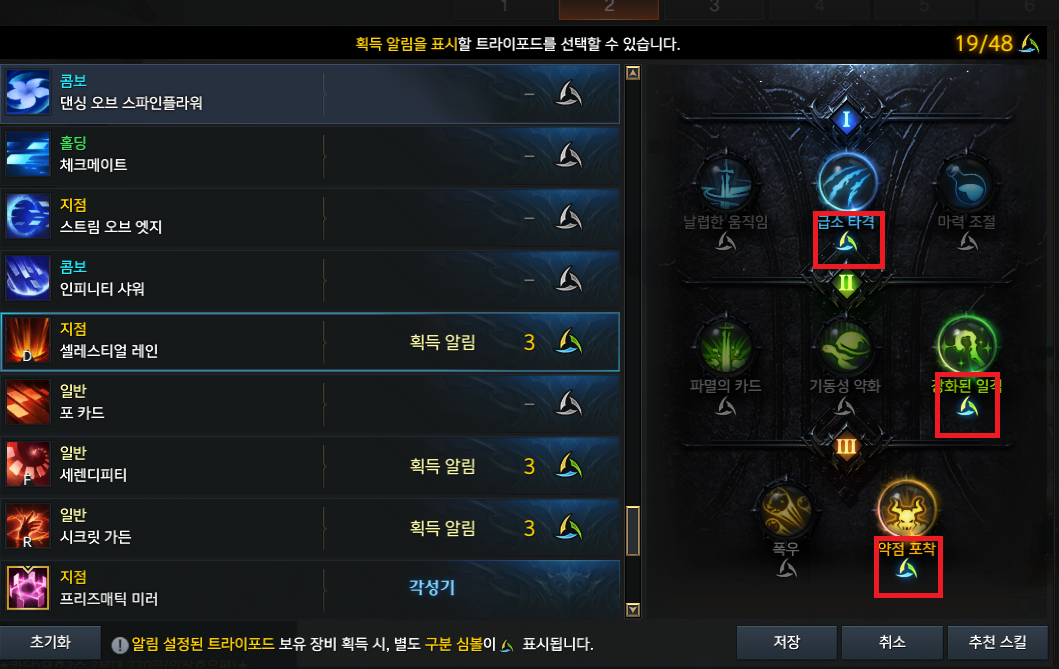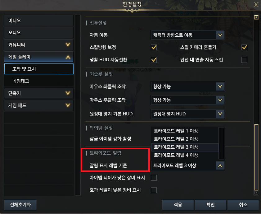 스킬창의 우측 하단에 알림 설정을 누르시면