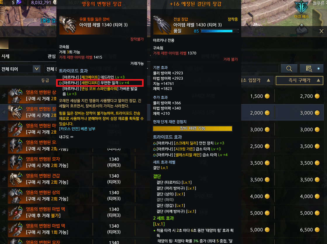 그럴 때 경매장에 올려진 '좋은 트라이포드 효과를 가진' 장비를 구매할 수 있습니다