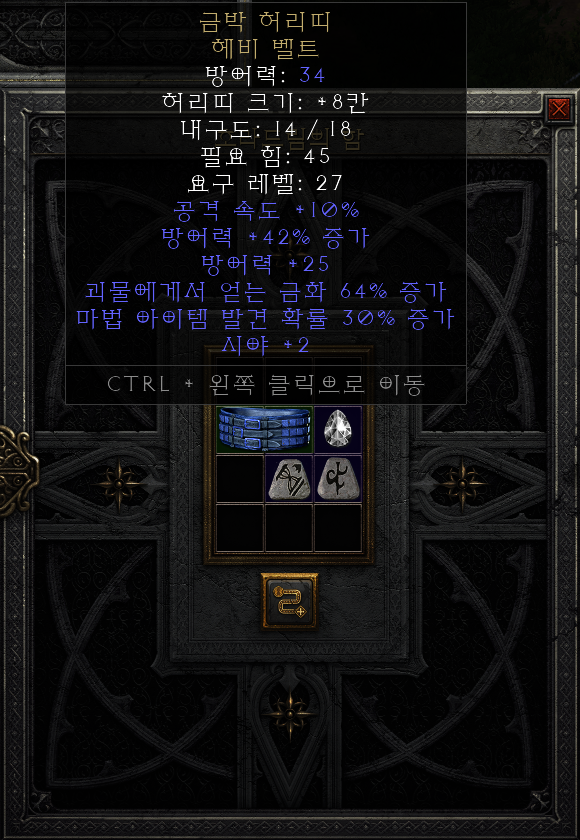 큐브에 노말 등급의 금박 허리띠와 탈(Tal)룬 + 샤엘(Shael)룬 + 최상급 다이아몬드를 넣어줍니다.